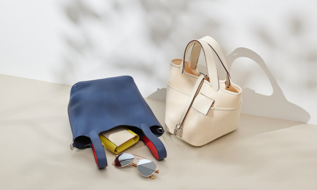 Contemporary Hermès handbags still wink at the brand’s riding heritage. The cream colored Picotin Lock bag ( Right) was named after a unit of horse feed and inspired by a horse’s feed bag . The casual Evelyne bag (blue, left, shown open) was originally designed in 1978 as a groomer’s tool bag with a perforated ‘H’ for ventilation .